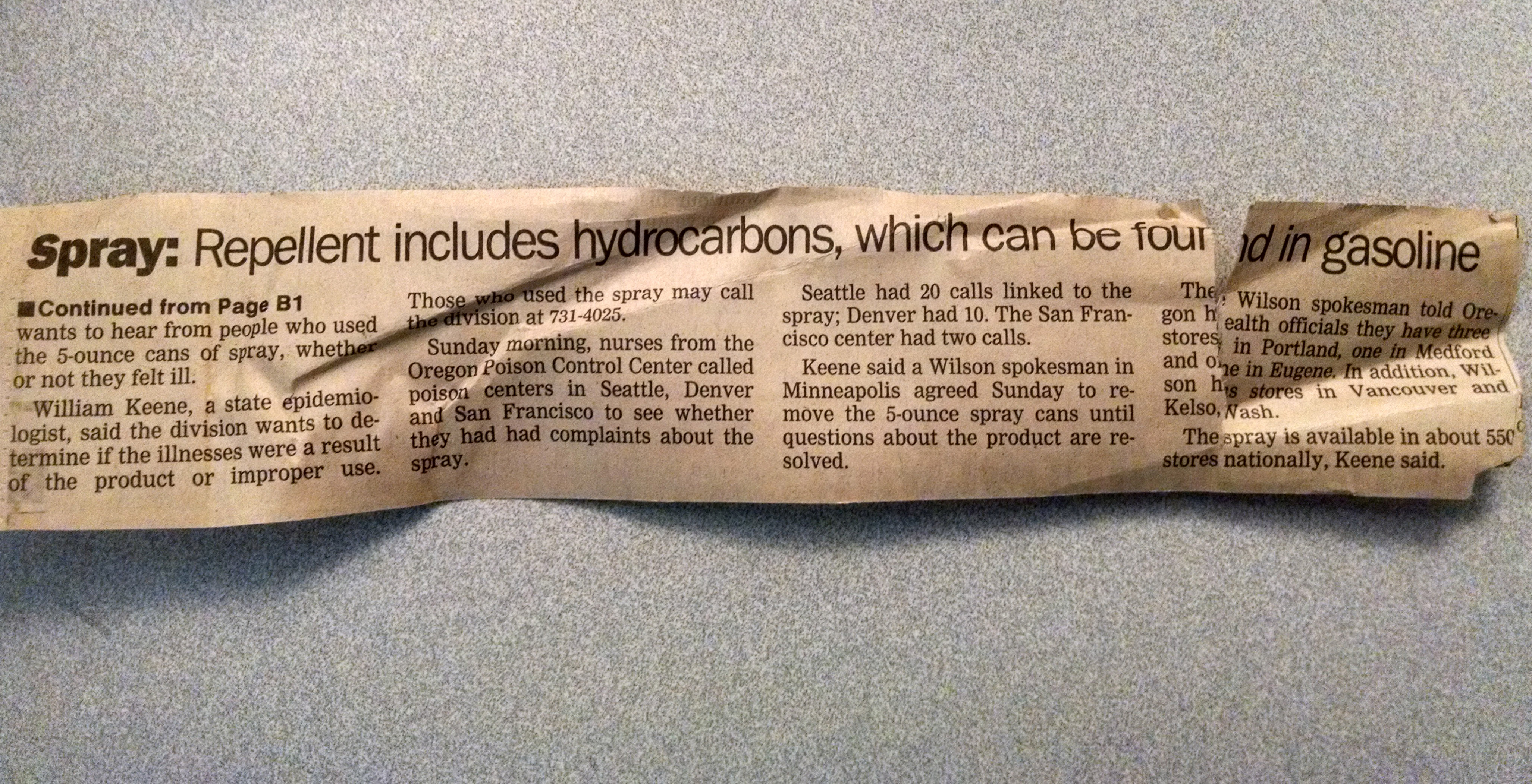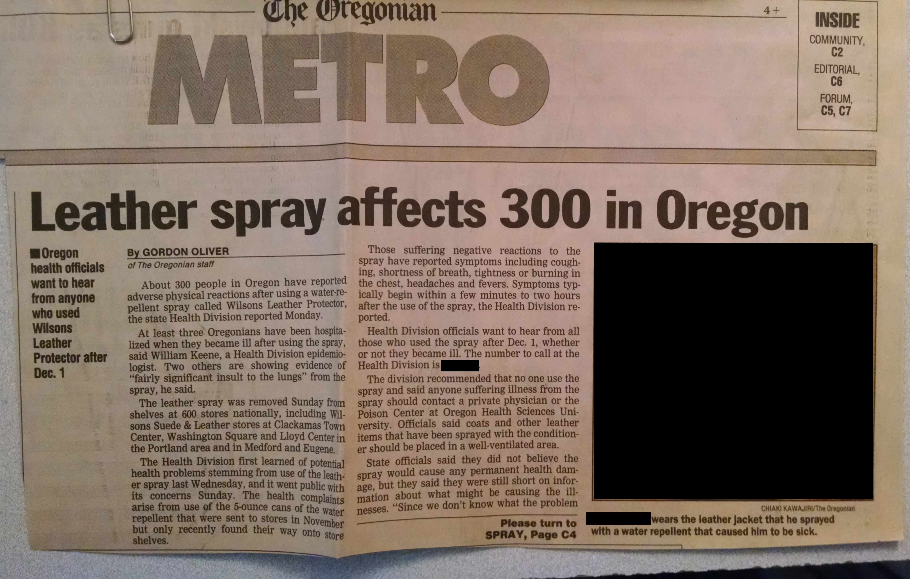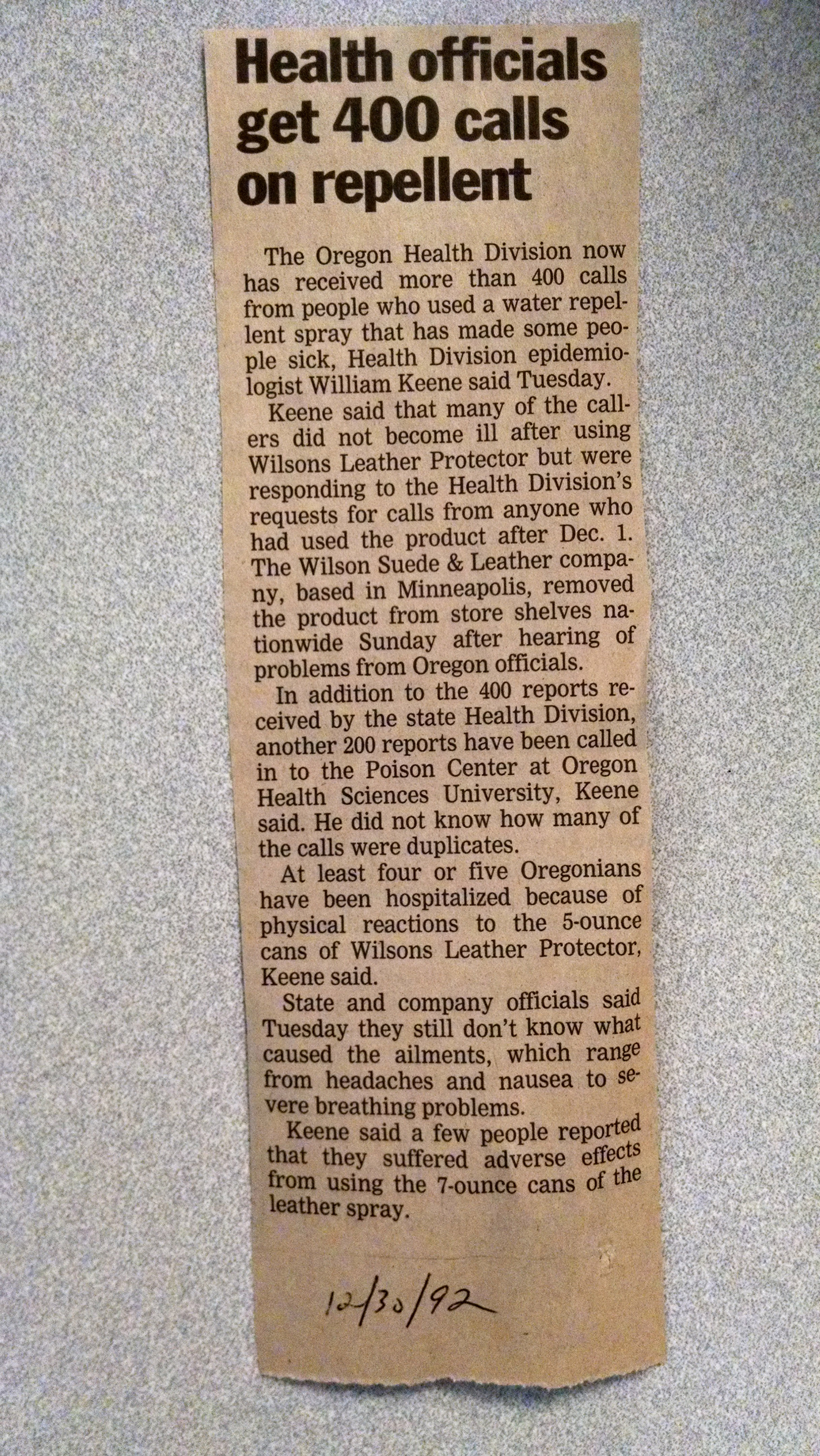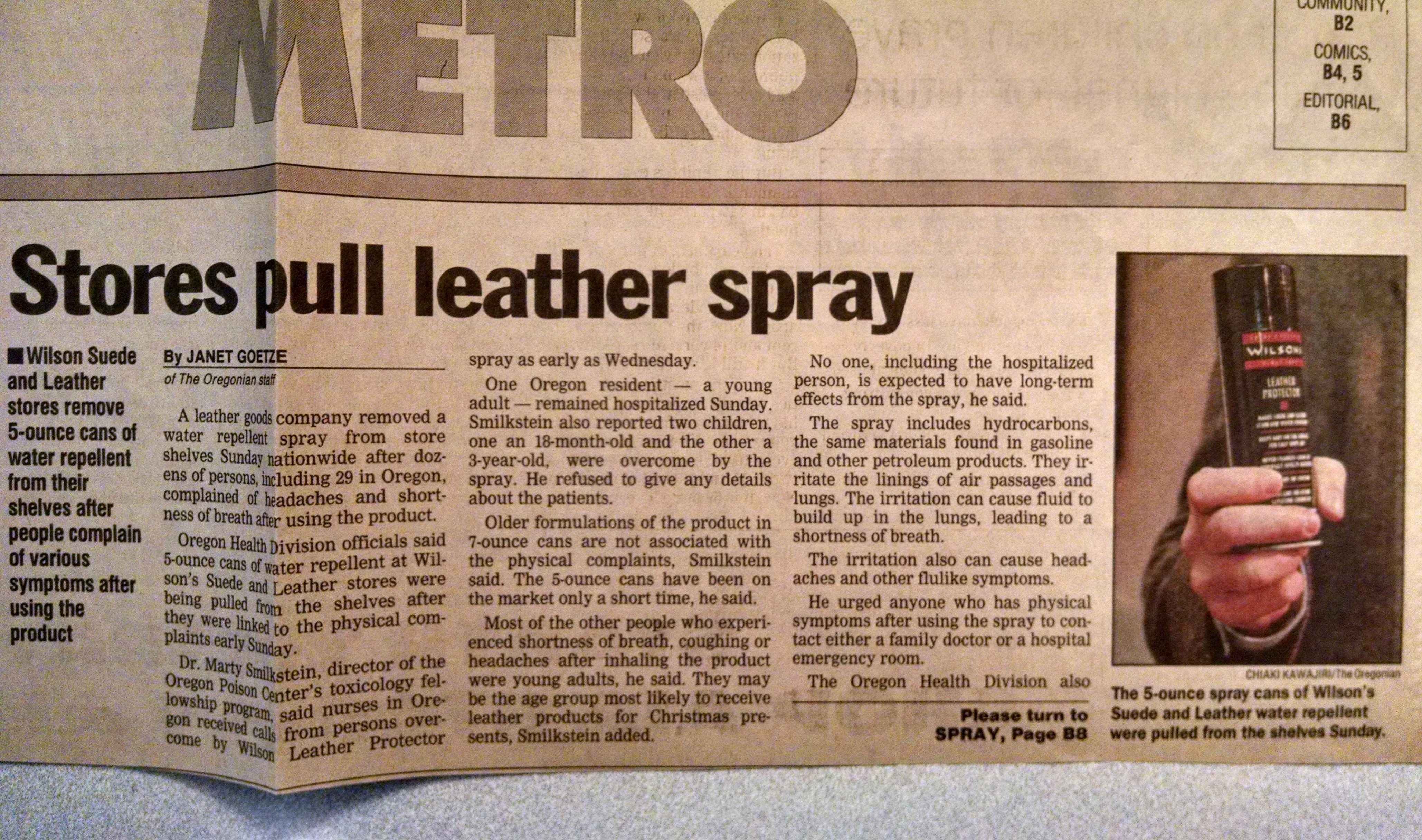 | On December 27th, 1992, reports filtered in over the course of several days that people were becoming ill following the use of an aerosol leather conditioner. Symptoms reported included prolonged cough, shortness of breath, pleuritic chest pain, headaches, malaise, chills, and fever. In total, reports increased to 400 persons, involving approximately 550 persons. The product, Wilson’s Leather Protector, was recalled by mid-day on December 27th. Six people were hospitalized.  |
