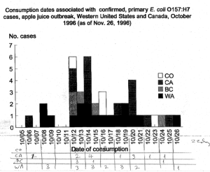 On October 16, 1996, Children’s Hospital in Denver admitted a 1 year old girl with diarrheal illness. She developed hemolytic uremic syndrome (HUS) and battled it for 2 weeks before succumbing on November 8, 1996. The toddler had consumed an Odwalla smoothie before becoming ill. On October 30, 1996, the Seattle-King County Department of Public Health and the Washington State Department of Health reported an outbreak of Escherichia coli O157:H7 infections epidemiologically associated with drinking Odwalla brand unpasteurized apple juice or Odwalla juice mixtures containing apple juice from a coffee shop chain, grocery stores, or other locations.